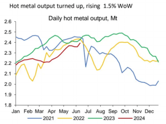 Average daily hot metal output among steelmakers surveyed hovered at a relatively high level of around 2.39 million tons as of June 27, despite a weekly fall of 0.2%, data from consultancy Mysteel showed.