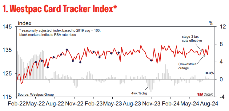 ― The Westpac Card Tracker Index* showed a little more life over the first two weeks of August, rising 1.5pts to 136.9. While that puts the index on a par with the high seen late last year, trend growth remains disappointing, barely tracking a small positive. Activity has firmed a little since the ‘Stage 3’ tax cuts came into effect but still looks to be declining in real, per capita terms.