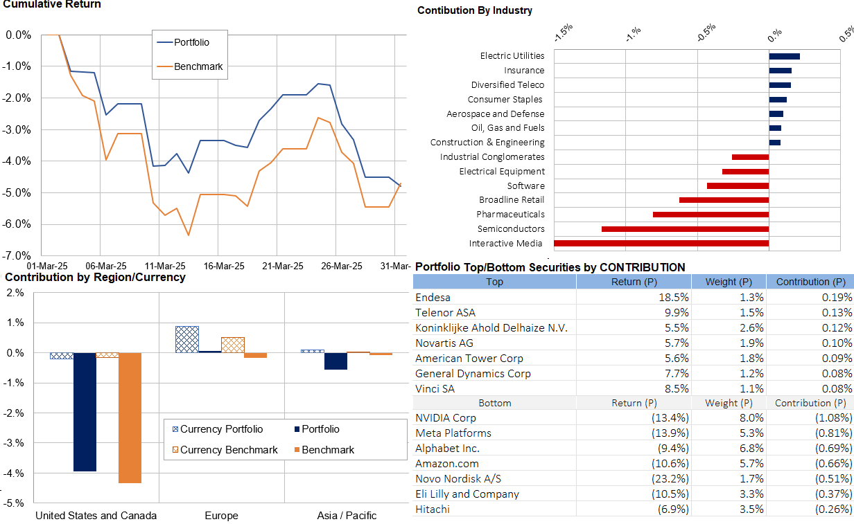 March saw the Bear market in full swing, with all growth stocks in retreat and only defensives in positive territory. Currency only helped the European stocks as the AUD treaded water with the USD. Early in the month we pivoted toward Europe given the election results and bought German stocks, Bunzl, Gea and Wartsila.
