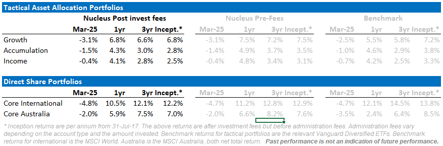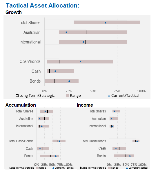 - Global markets are off 17-18% in USD terms, but the Australian dollar has fallen, so more like 10% for Australian investors. We are a little underweight international, relying on the Australian dollar to cushion the downside, which it has so far.