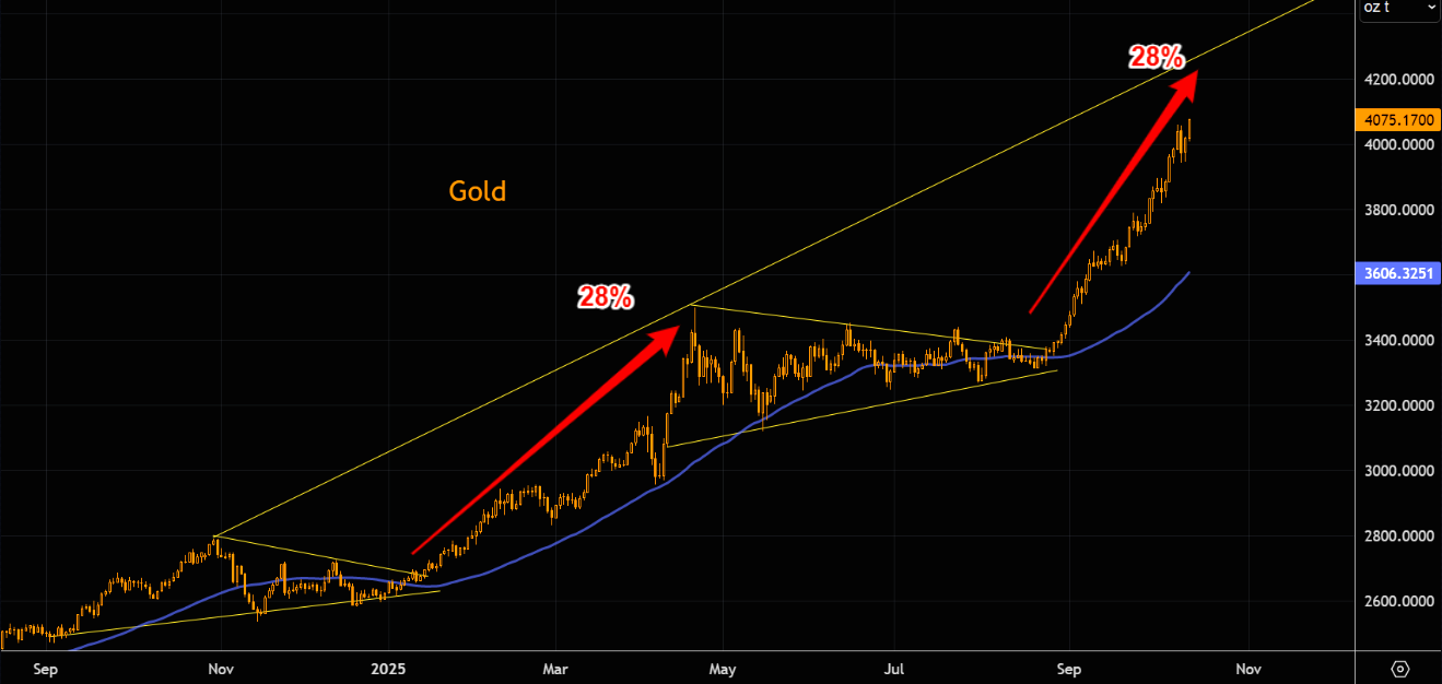 Gold’s “unstoppable” upside trajectory continues. We have been pointing out the similarity with the early 2025 break out move for weeks. That triangle break out saw gold surge by around 28%. Apply the same percentage gain to the late August break out and we could reach around $4300, just where the upper part of the trend line comes in.