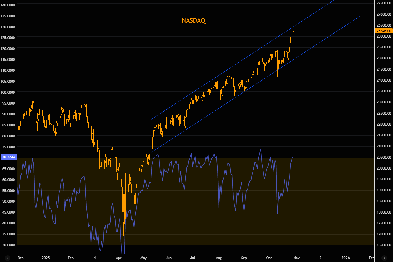 NASDAQ extending the squeeze, approaching the upper part of the channel as RSI trades above 70 again. We are in overbought land again, but as we all know, things tend to stay in overbought/sold territory for longer than most think possible.