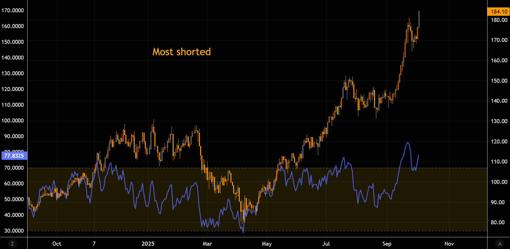 Most shorted needs a bigger chart soon. Note that we are in overbought territory, but RSI is actually slightly lower than what we saw during the latter part of September.