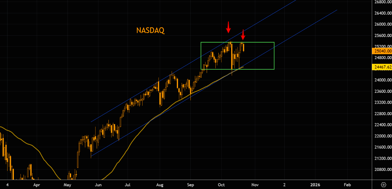 NASDAQ reversed right at the upper part of the range. Note the slightly lower high as we continue trading the range. Despite all the narratives, equities have done little (but produce volatility) since mid September. 50 day comes in at the lower part of the big trend channel.