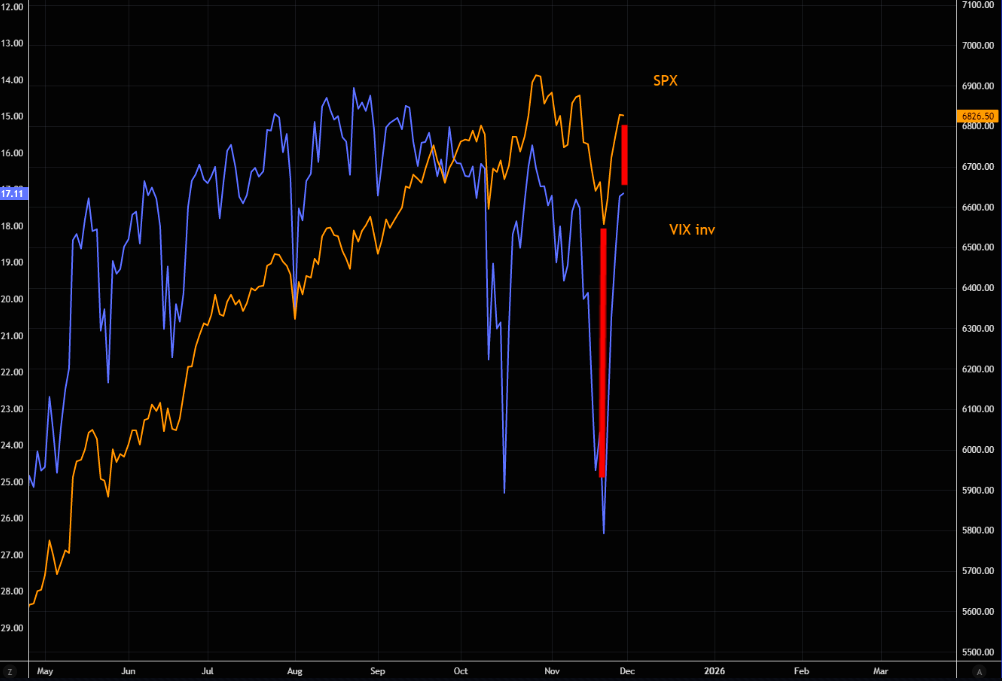 The extreme VIX vs SPX gap is gone. Chart shows SPX vs VIX (inverted).