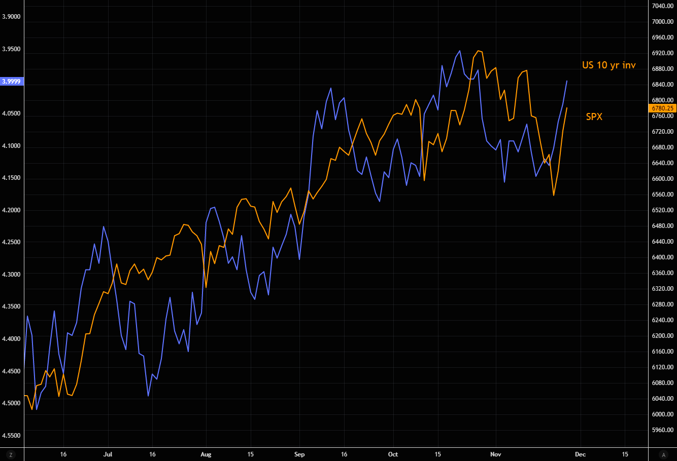 …follow the 10 year, but the US outlook is murkier than many think. Hatzius’ (GS) call for a Dec-10 rate cut lines up with softer alternative labor data showing the economy may be losing momentum. The slowdown may be necessary: once tariffs fade, tax cuts arrive, and financial conditions ease further in 2026, the backdrop should turn far more market-friendly. Chart shows NDX vs US 10 year (inverted).