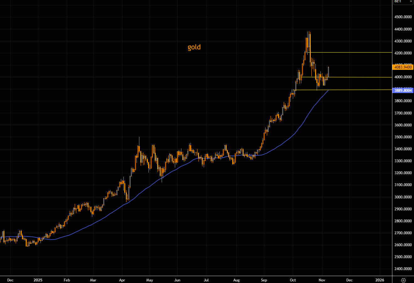 Gold found support on the big $3900 level, and was close to the 50 day. The shiny metal is putting in the biggest up candle (as of writing) since the sell off began. We are well above the $4000 area. Next bigger resistance at $4200 and then all time highs.