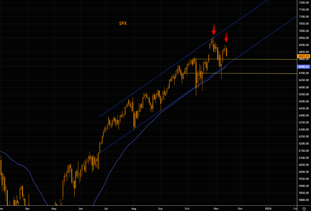 SPX may be carving out a lower high, not a bullish look. 6800 is the key short-term support in futures; lose that and you’re into the channel lows and 50-day near 6750, with the big 6700 zone right below.