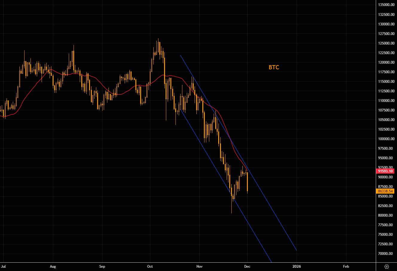 BTC continues trading inside the perfect trend channel that has been in place since the puke began. Note the reversals off the 21 day.