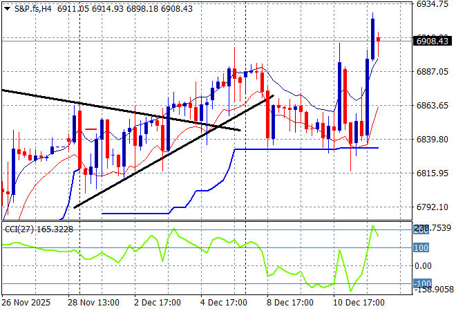 S&P and Eurostoxx futures are steady after a mixed session last night with the S&P500 four hourly chart showing how the previous breakout on the Fed rate cut might be followed through depending on a potential Santa rally that outweighs the usual volatility:
