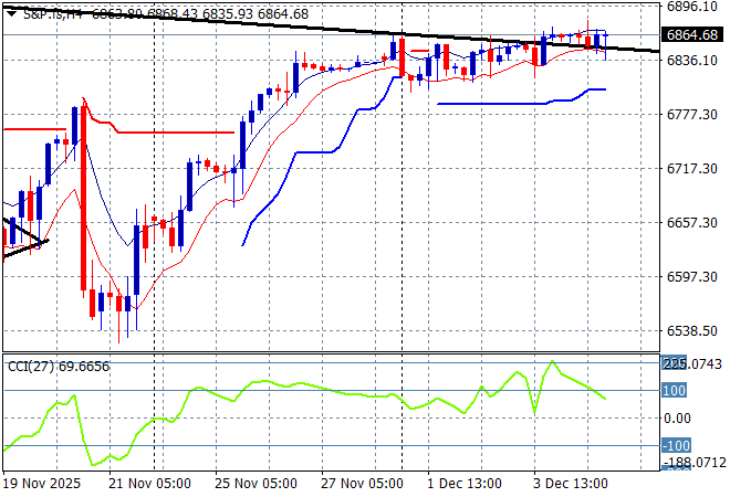 The four hourly chart showed that resistance at the 6900 point level was still quite relevant after the bounceback from the end of the US government shutdown rally with recent price action trying to avert last week’s dead cat bounce pattern. Support has firmed but lacklustre so far: