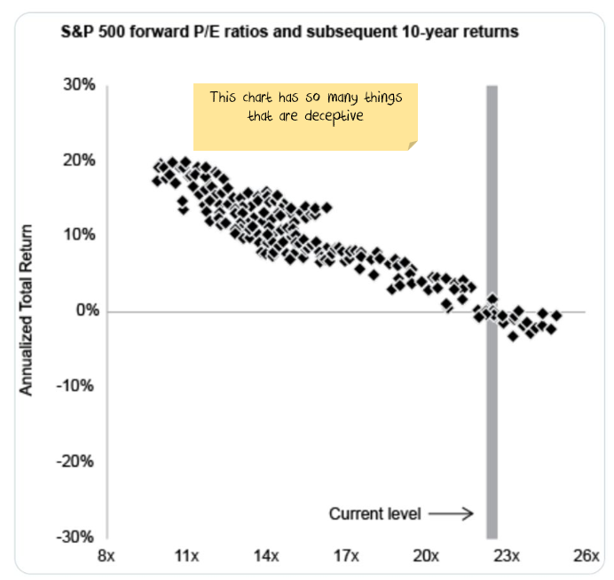 I’ve been seeing a particular type of chart circulate more frequently: the one plotting the S&P 500’s forward price-to-earnings ratio against the market’s subsequent 10-year returns. At first glance, it looks authoritative — hundreds of data points neatly arranged, a strong downward relationship, and a clear takeaway that today’s high forward P/Es imply a lost decade ahead. For many, it feels like a reliable warning signal.