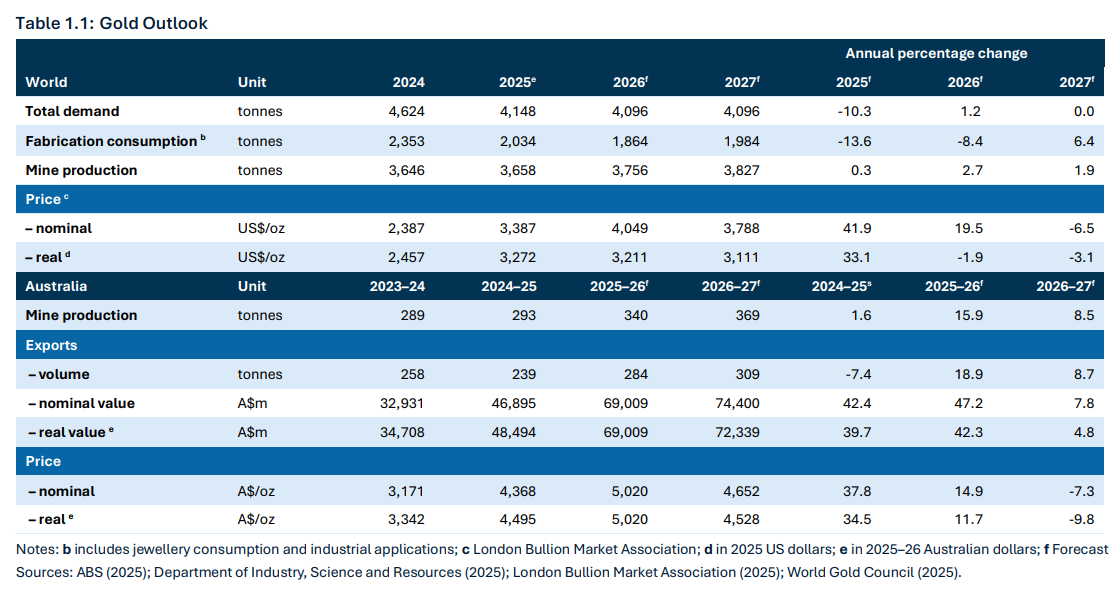 Bulk commodity prices are assumed to decline from elevated levels over four quarters to the end of the December quarter of 2026: the iron ore spot price is assumed to decline to US$60/tonne; the metallurgical coal spot price declines to US$140/tonne; the thermal coal spot price declines to US$70/tonne; and the LNG spot price converges to US$10/mmBtu. The gold price is assumed to decline over eight quarters to a long-run anchor. All bulk prices are in free on board (FOB) terms.