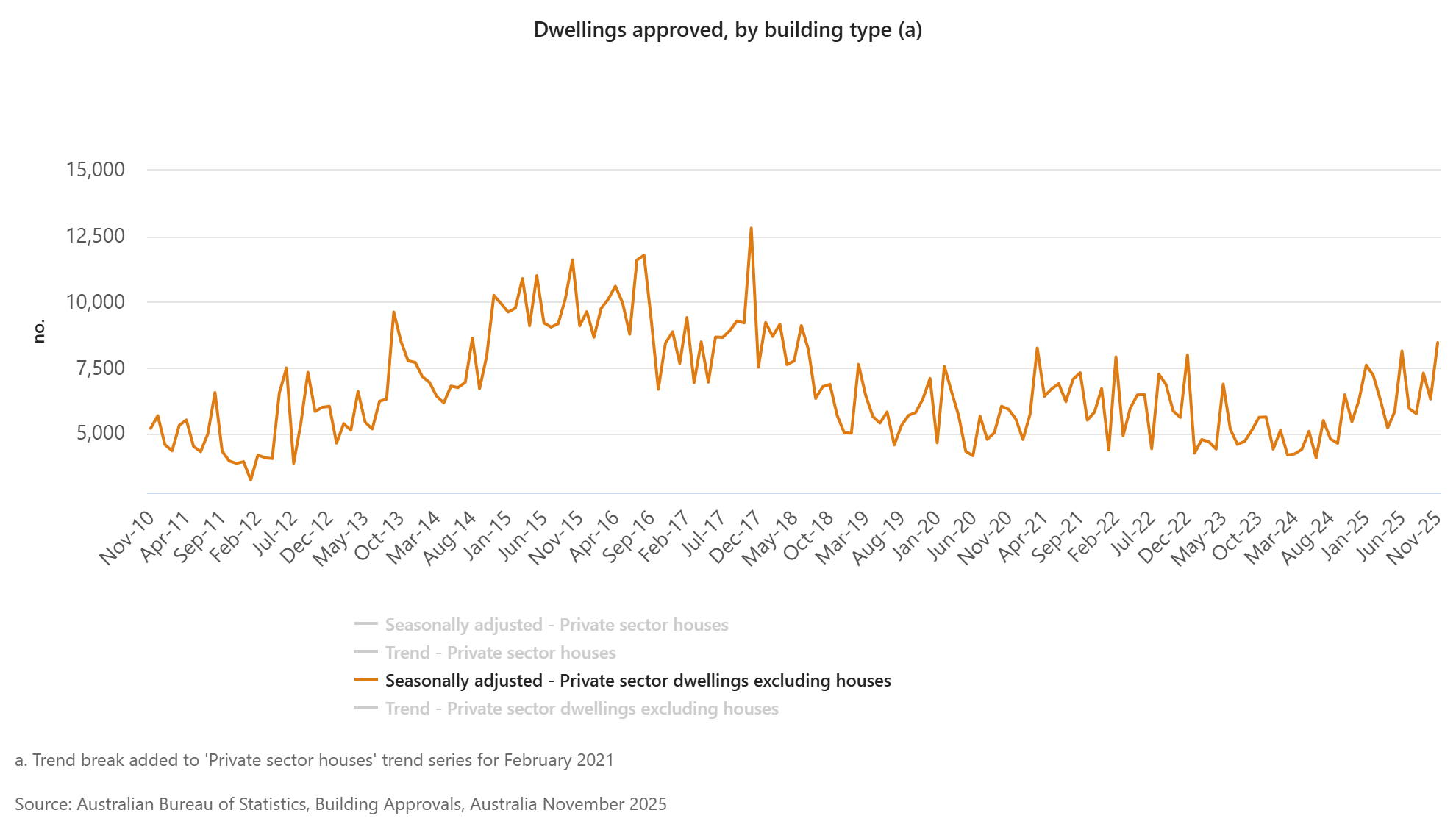 With the release of the latest ABS Building Approvals data, it was revealed that non-detached house approvals had risen to their highest level since June 2018, up by 34.1% month on month and 55.3% year on year to 8,463 for the month of November.