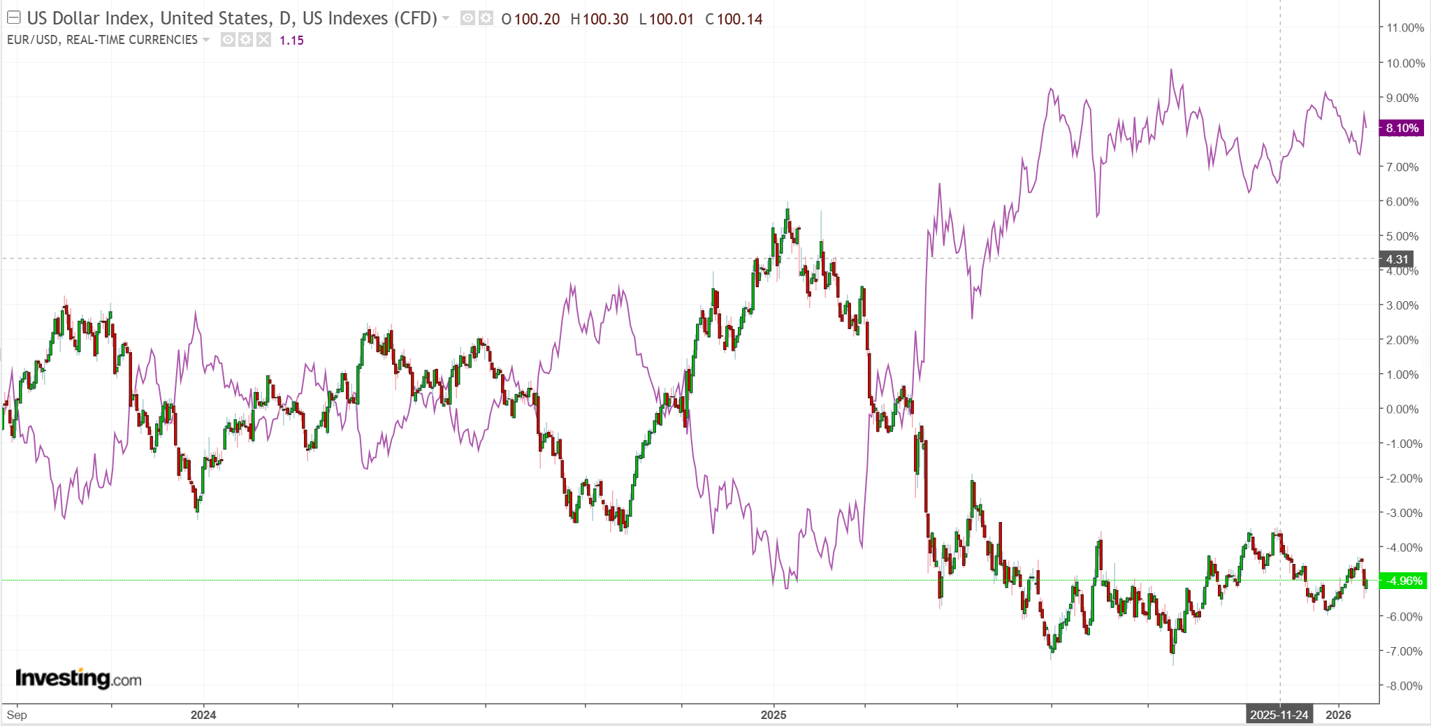 DXY popped overnight as a triple bunga of the Supreme Court frowning at Trump Fed interference, Greenland calm, and firming Japanese yields let air out of the pressure cooker.