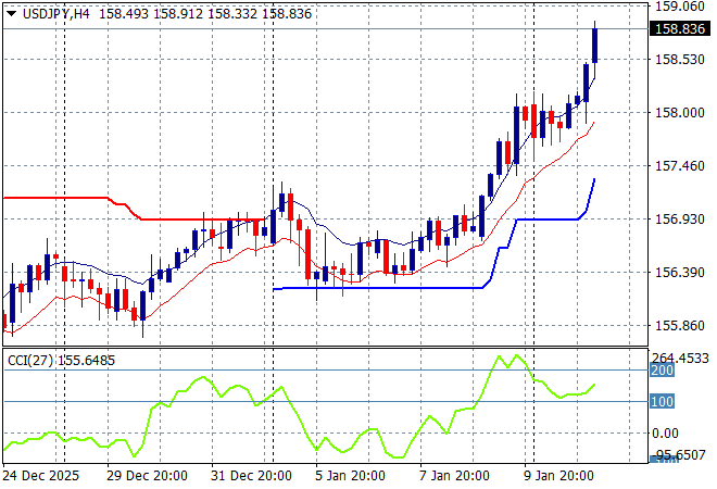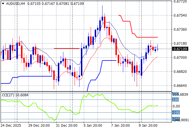 Asian share markets are booming in today’s session led by Japanese shares as BOJ and government officials try to talk down the volatility around Yen as it weakens steeply against USD. However looming risk from the Trump regime’s attacks on Federal Reserve’s independence threatening ratings while the possibly of the Supreme Court reversing the tariffs is rising as the Orange Mussolini starts fretting about losing “trillions of dollars.” Add the Iranian situation into the mix having now forgotten about the intervention in Venezuela, 2026 is getting interesting. The Australian dollar is now back above the 67 cent level but for how long.