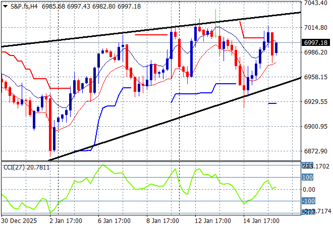 S&P futures are trying to make headway with the S&P500 four hourly chart still unable to get up towards the 7000 point level and potentially rolling over here as the rising wedge closes in: