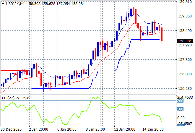 Mainland Chinese share markets are going nowhere in the afternoon session with the Shanghai Composite down just 0.1% while the Hang Seng Index is also dead flat just below the 27000 point level. Japanese stock markets are in mild retreat with the Nikkei 225 down nearly 0.4% to stay below the 54000 point level while Yen is firming for once, with the USDPY pair back down to the mid 158 level: