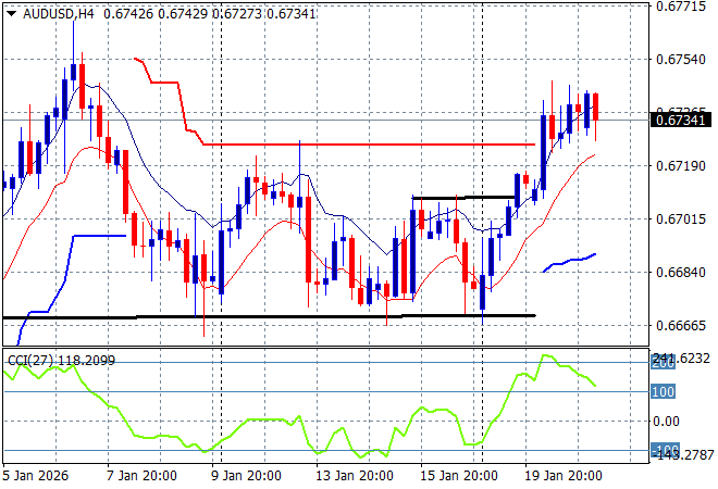 Asian share markets have fallen across the region although Chinese shares remain resilient in the wake of the selloff on Wall Street overnight on a broader “America-off” strategy by all risk markets. Gold is heading higher faster while the USD is losing ground against all the majors yet again. Oil prices remain in flux with the Iranian situation while the Australian dollar continues to lift off support at the 67 cent level.
