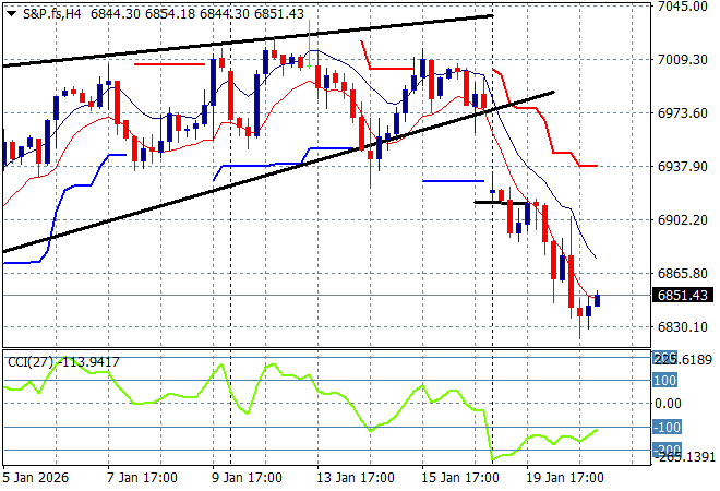 S&P futures are unsteady but look like sending Wall Street down further with the S&P500 four hourly chart showing a mini correction underway but has some support at the 6800 point level: