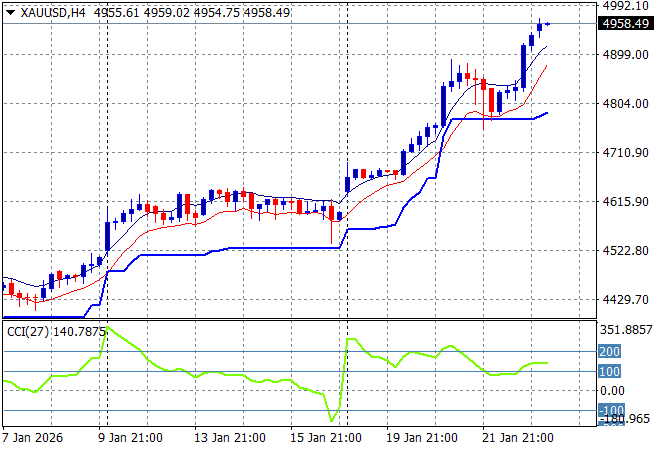 Brent crude is easing to just above the $64USD per barrel level while gold is on track to hit another new historic high as the $5000USD per ounce level comes into sight: