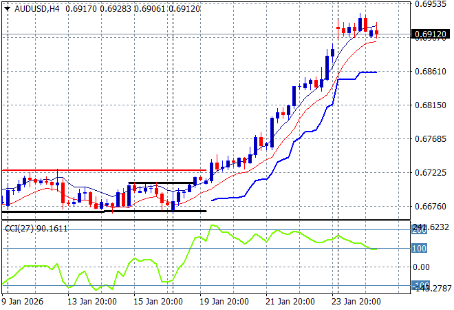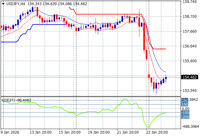 Mainland Chinese share markets are up in the afternoon session with the Shanghai Composite pushing 0.5% higher to remain well above the 4100 point level while the Hang Seng Index is up more than 1% to crack the 27000 point level. Japanese stock markets are bouncing back with the Nikkei 225 up 0.7% to stay above the 53000 point level while Yen is losing some ground against USD although its all relative with the big drop in the USDPY pair keeping it down nearer the 154 level: