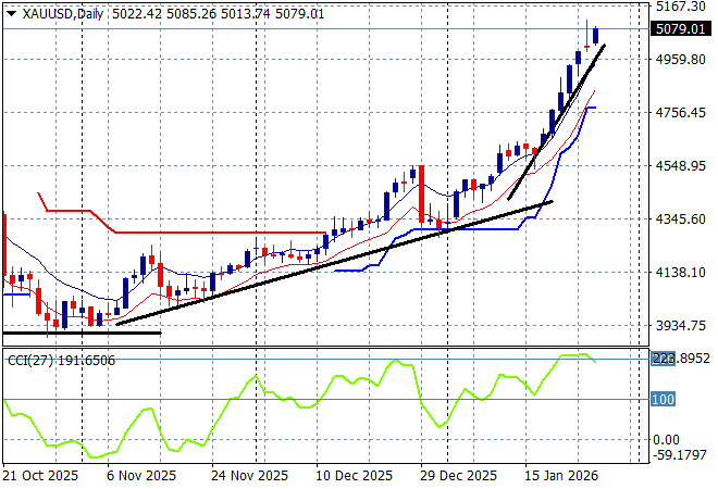 Brent crude is easing to just above the $64USD per barrel level while gold is on fire as it bursts through the $5000USD per ounce level in a swift uptrend: