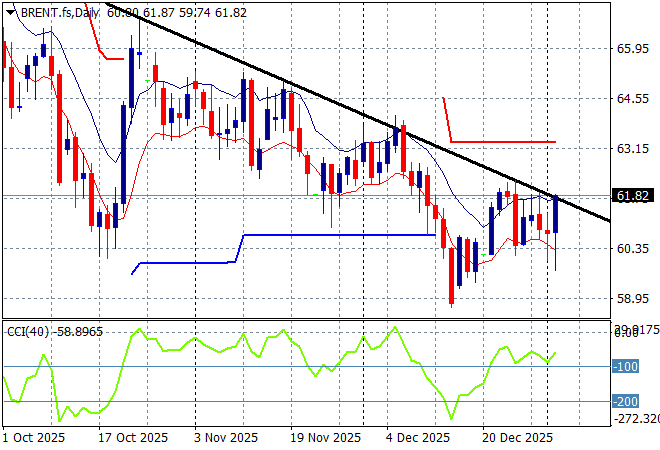 Oil markets have been on a multi week/monthly downtrend prior to all the Venezuelan invasion with Brent crude recently pushed below the $59USD per barrel level and post the Maduro capture, their has been a small lift overnight to just below the $62 level.