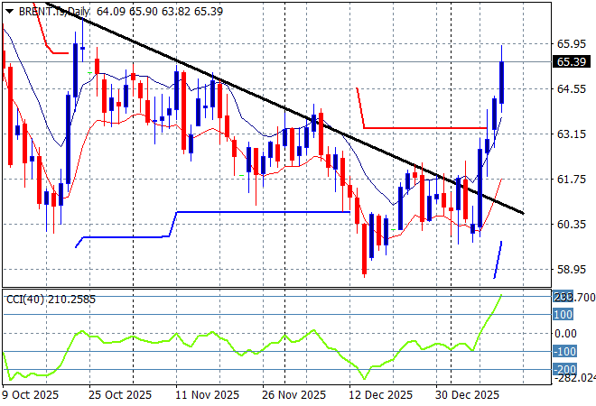 Oil markets have been on a multi week/monthly downtrend prior to the Venezuelan invasion with not much upside thereafter, but things are brewing as Brent crude shot up above the $65USD per barrel overnight on the Iranian revolts.