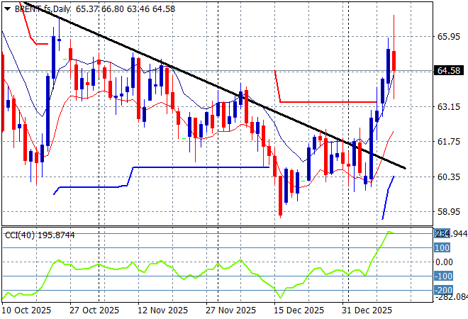 Oil markets have been on a multi week/monthly downtrend prior to the Venezuelan invasion with not much upside thereafter, but things are brewing as Brent crude shot up above the $65USD per barrel in a quick rally on the Iranian revolts before getting quite volatile overnight on the big US gasoline inventory build up report.