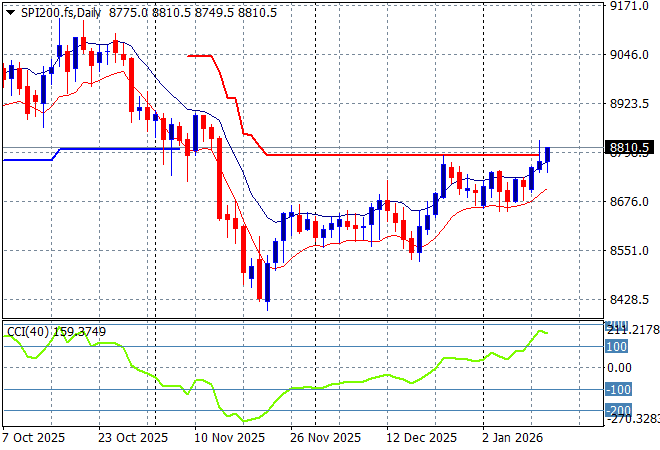 The daily chart pattern shows that short term support has been reinforced after a period of hesitation before Christmas with a bounceback above resistance at the 8800 point area now building: