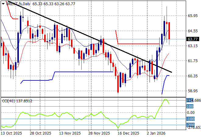 Oil markets have been on a multi week/monthly downtrend prior to the Venezuelan invasion but shot out of the gate last week with some big gains, which were then arrested swiftly overnight as the Israelis stepped in. Brent crude fell nearly 5% to below the $64USD per barrel with the potential for more falls if the Trump regime doesn’t start shooting soon.