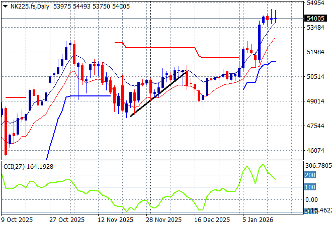 Japanese stock markets finally pulled back after being bid strongly all week with the Nikkei 225 down nearly 0.5% to almost retreat below the 54000 point level.