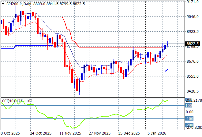 Wall Street lifted slightly on a better than expected weekly initial jobless claim print in the US (led by the fact that you can’t be jobless if you’re in an ICE concentration camp or on a plane exiting the country) while oil prices dived 5% on news the Iranian strikes by the Trump regime were curtailed by the Israelis. The USD lifted solidly against most of the majors, particularly Euro while precious metal prices stabilised as the Australian dollar remains below the 67 cent level but is finding some support.