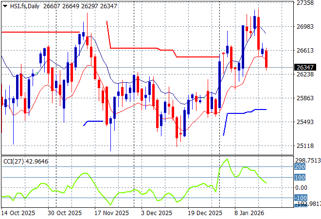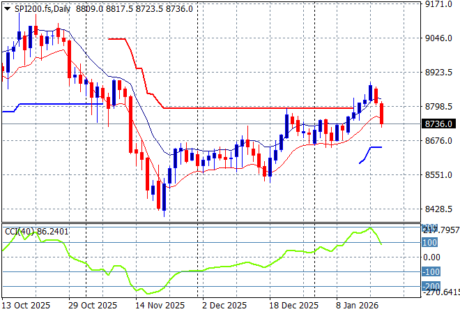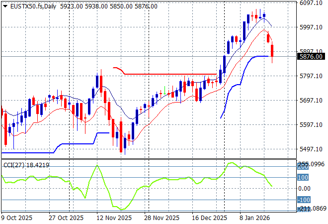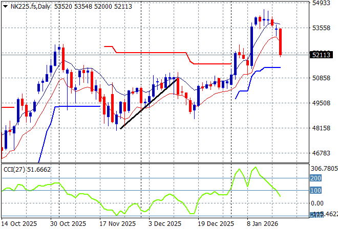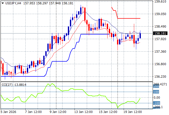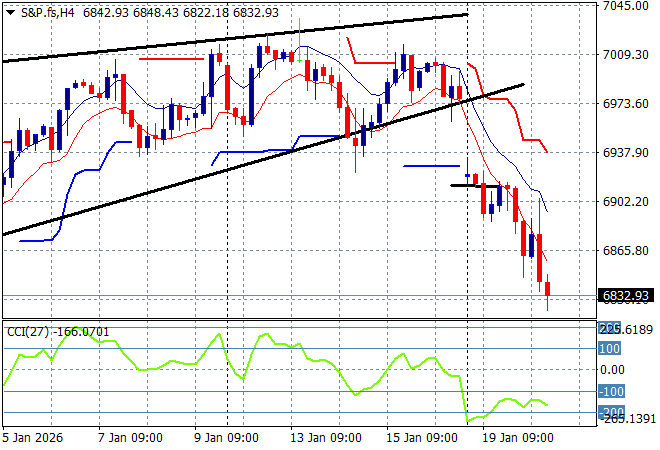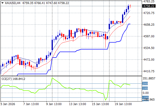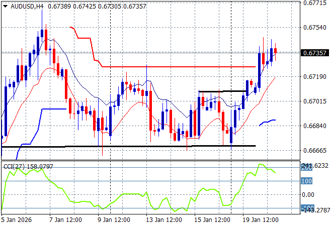 Wall Street came back from its long weekend holiday and sold off immediately in response to the EU revokation of the previous Trump-induced 2025 trade deal as the fallout from the shambles over Greenland hit all risk markets. Treasury yields spiked as European bondholders started selling off US bonds, with the 10 year up near the 4.3% level while the USD fellback against, well everything. Japanese bonds should be more of a concern plus the rhetoric coming out of Davos that a global recession – a long term one too – is likely given the change in the global trading order. The Australian dollar soared back above the 67 cent level alongside gold.