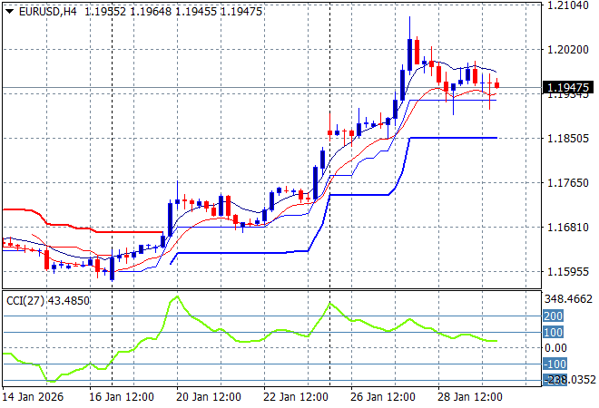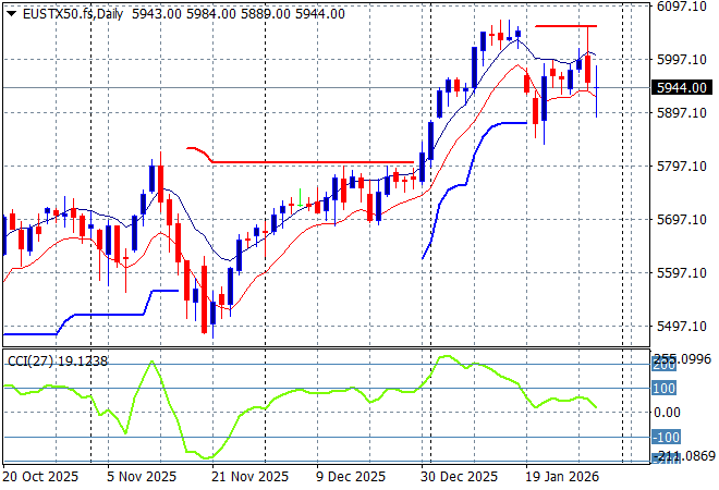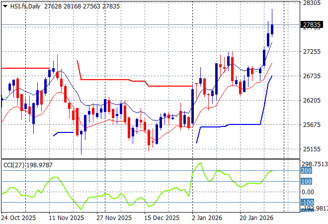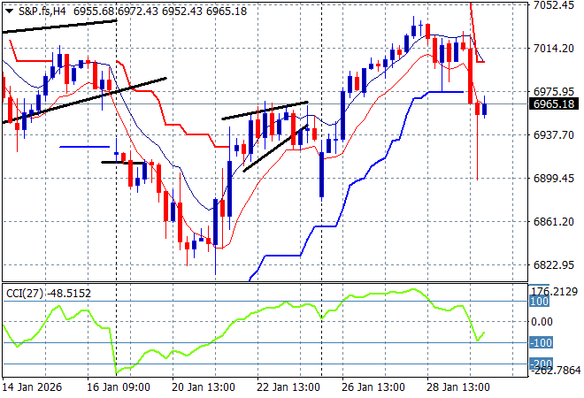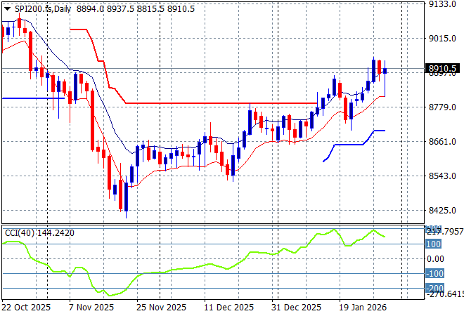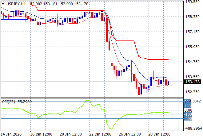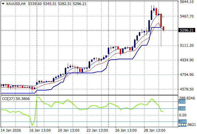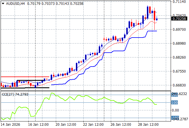 Overnight saw Wall Street take a hit on tech stock earnings with Apple the next cab off the rank this evening. Microsoft slumped while Meta surged as Tesla stumbled, while European stocks remain hesistant as the war drums are beating in the Middle East. Oil prices continue to surge on the upcoming Iranian/US war while gold finally pulled back from its epic run after being extremely overbought. Other undollars also paused their structural moves against USD with the Australian dollar still holding above the 70 cent level.