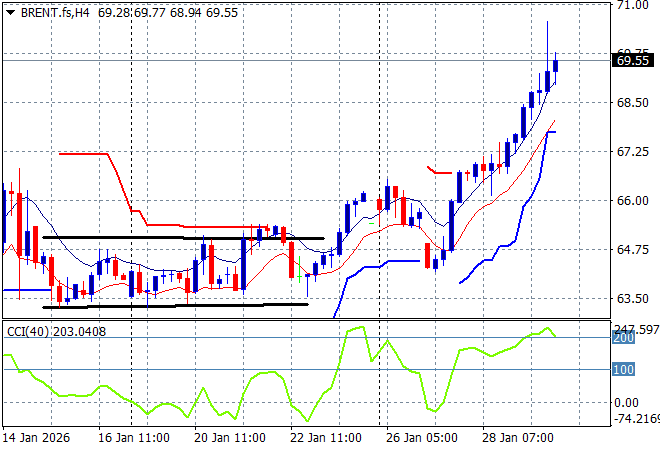 Oil markets have been on a multi week/monthly downtrend prior to the Venezuelan invasion but shot out of the gate last week with some big gains but have now morphed from a sideways pattern to a breakout on the upcoming Iranian war. Brent crude has surged again to move above the $69USD per barrel level overnight but is now extremely overbought: