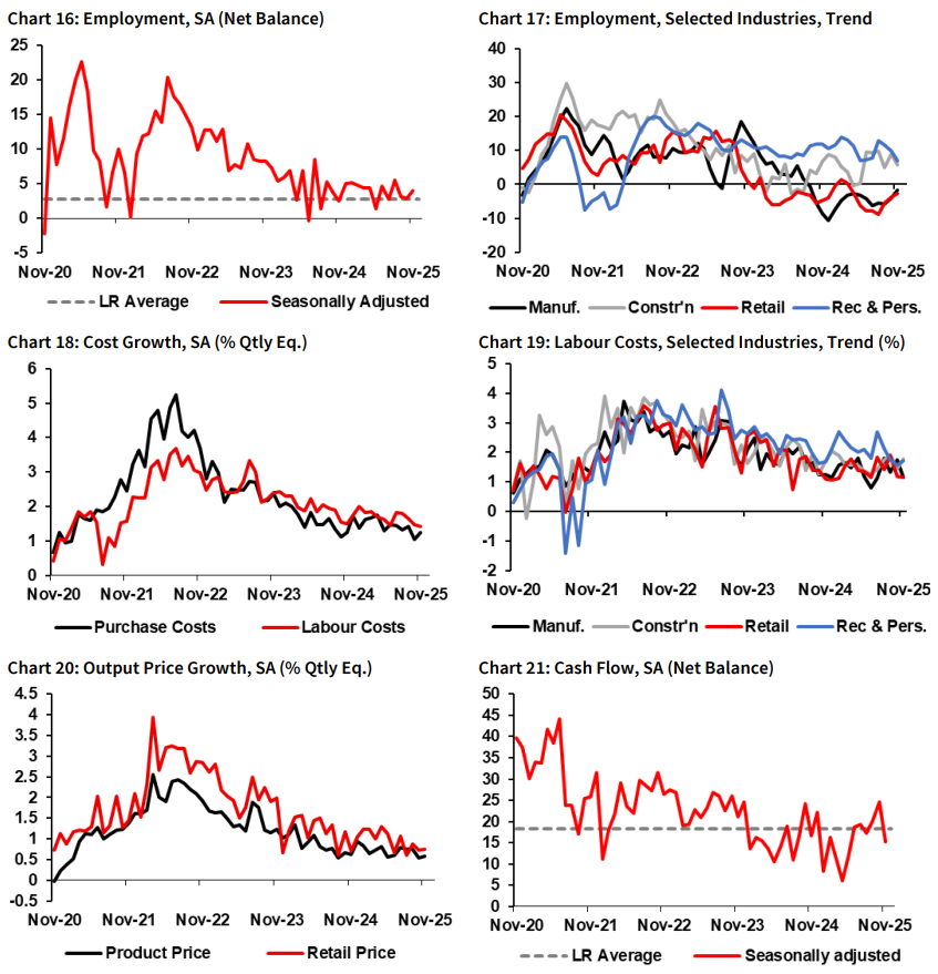 Profitability also improved, with the profits index rising three points to +7, while employment held steady at +4.