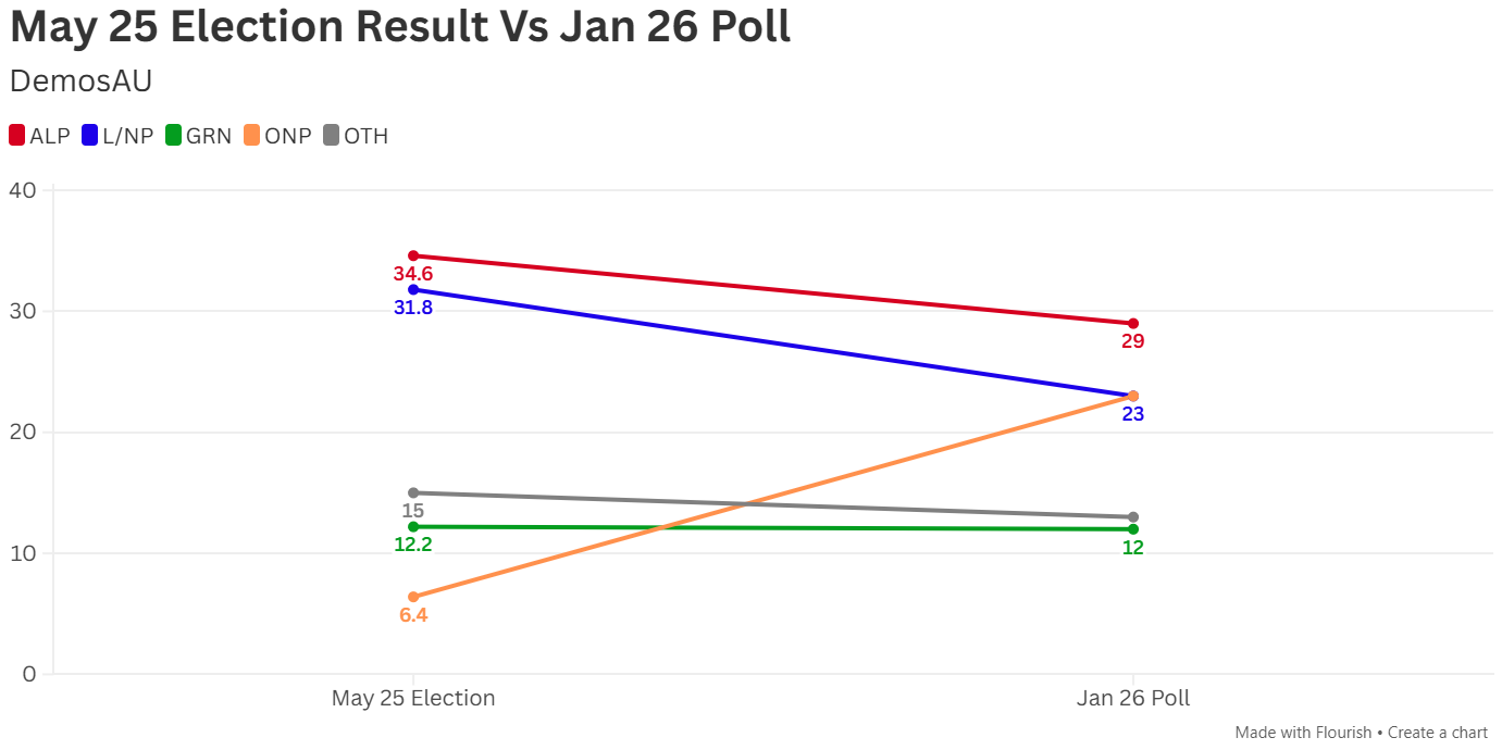 According to DemosAU, the Coalition gained 23% of the primary vote, along with One Nation, while Labor received 29% and the Greens 12%.