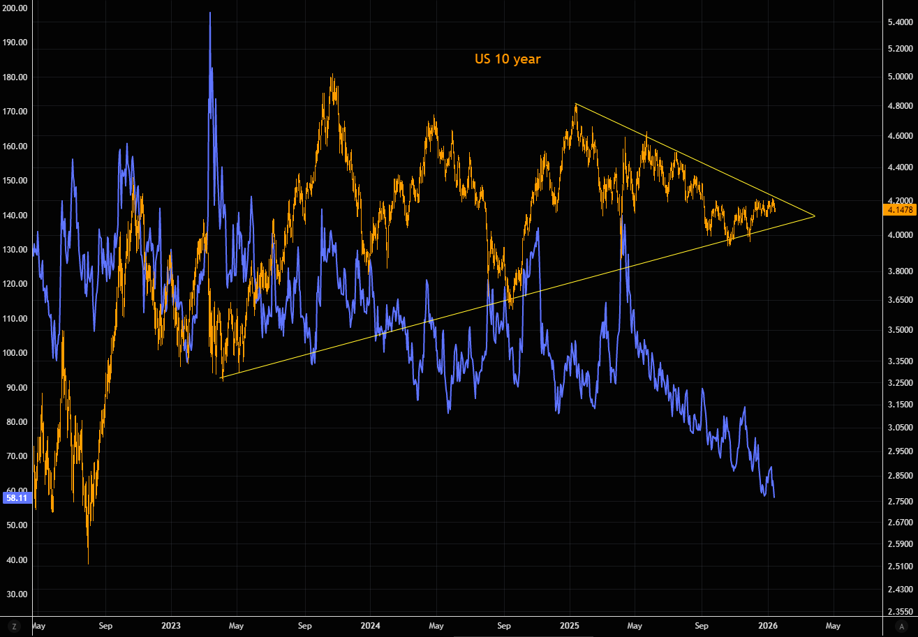 US 10 year has done very little over the past months, and we are actually trading at the same levels we traded at in late 2022. This has been reflected in bond volatility. MOVE has crashed since the Liberation day chaos, but note the 10 year is getting increasingly trapped inside a massive triangle like formation. A break out of that dynamic formation and things could MOVE again.