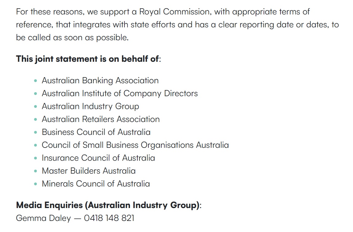 Their media page has no mention either. They too provide a mobile number which checks out, and they certainly came out with a Media statement about the Declaration of Terrorist incident on 16 December so we can presumably expect one real soon about their support for a Royal Commission.