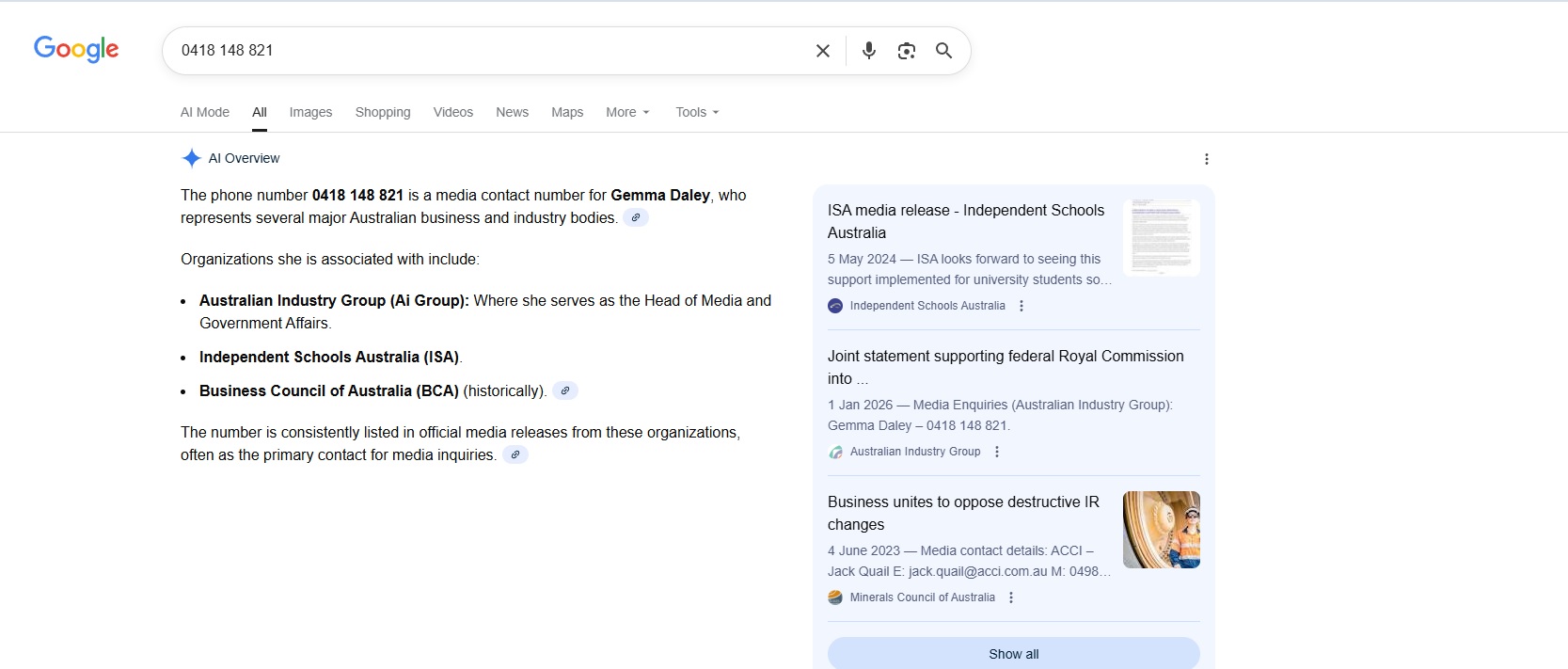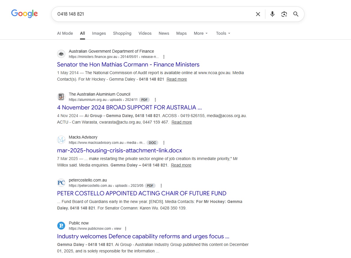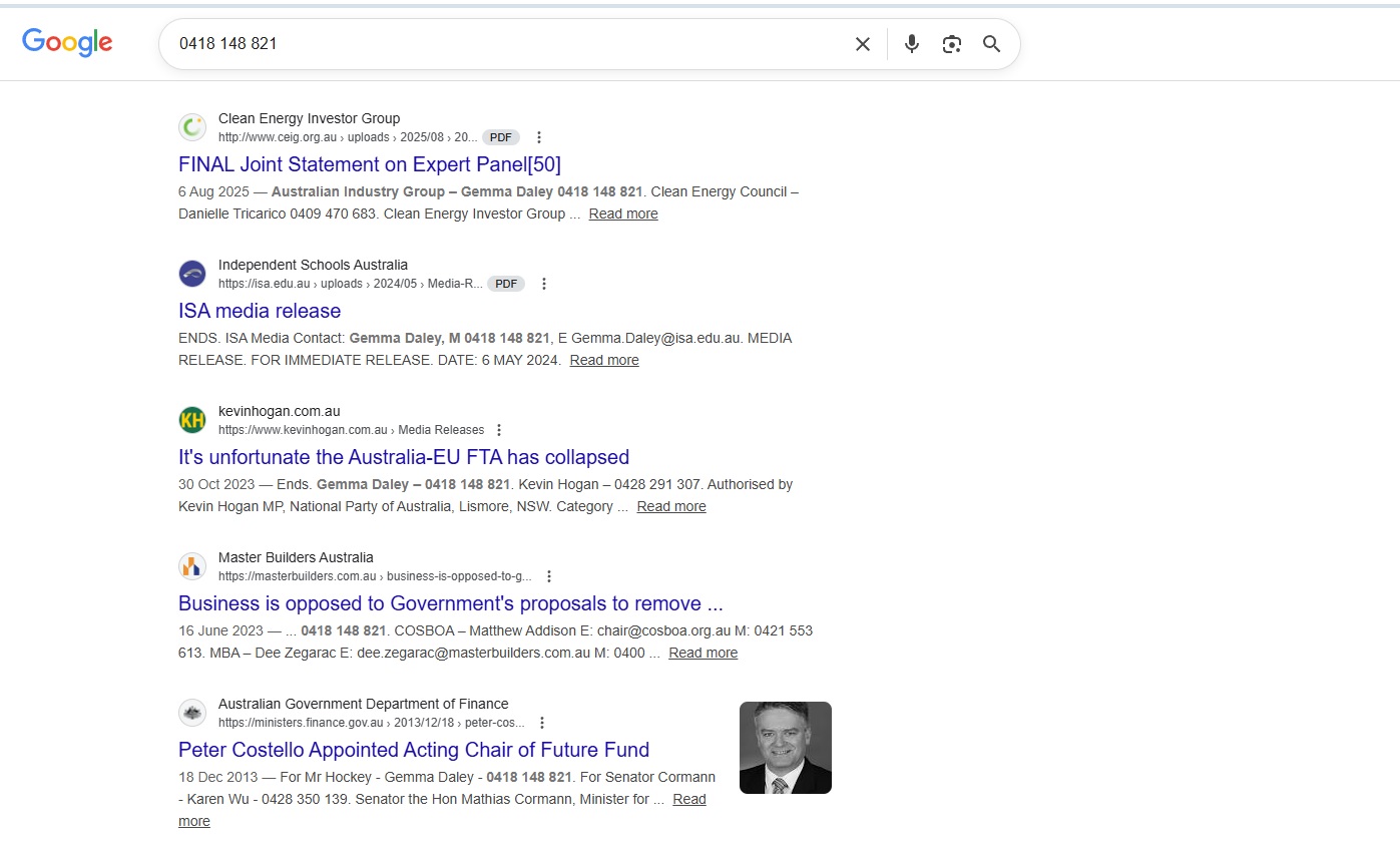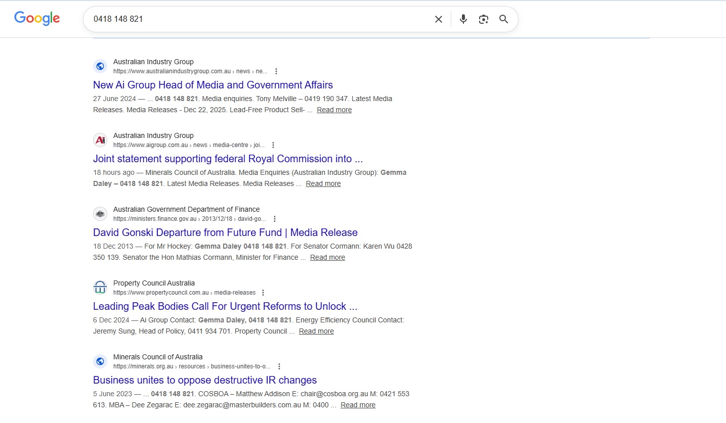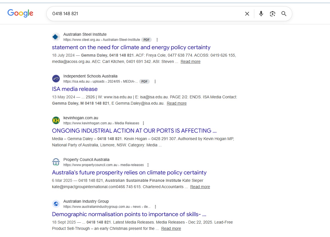 Type that phone number ‘0418 148 821’ into Google. When done this morning 3 January 2026 it has brought up a number of pages for whom Gemma Daley is a contact for, or has done time with. These include