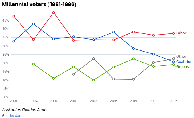 At the May 2025 federal election, the Coalition secured just 21% of the primary vote of the members of Gen Y, only marginally above the Greens at 19% and well below Labor at 37%.