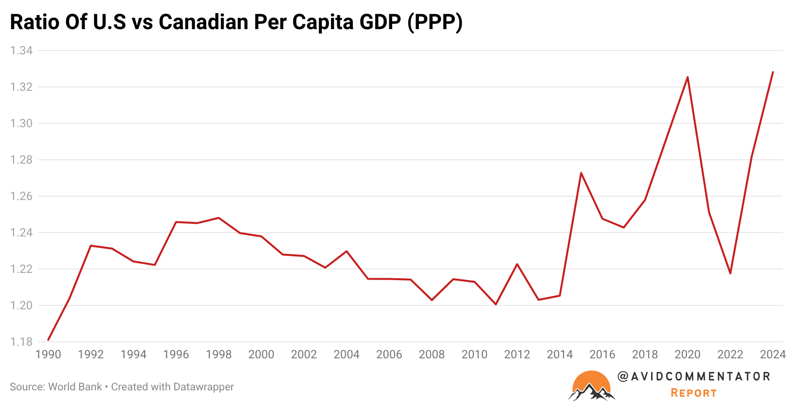 In it, the author asserted that, based on per capita GDP adjusted for Purchasing Power Parity (PPP), Canada was now poorer than the U.S. state of Alabama.