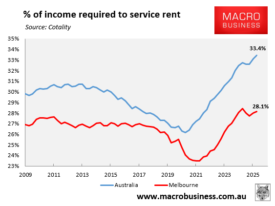 In Q3 2025, the share of income necessary to rent the median home in Melbourne was 28.1%, which was significantly lower than the national average of 33.4%.