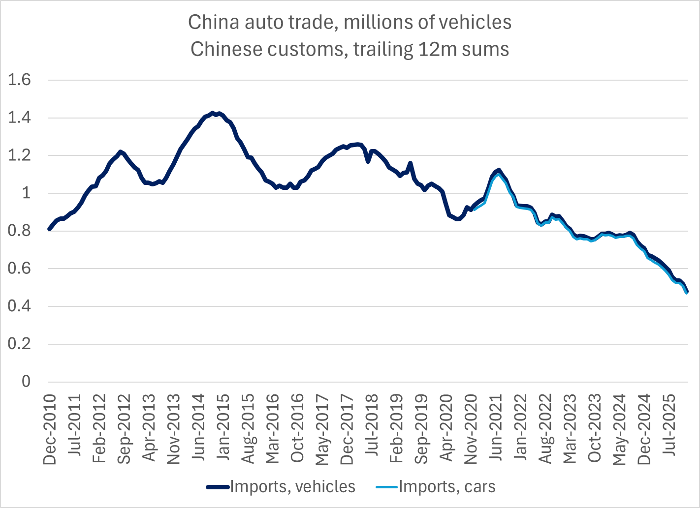 In late 2014, Chinese automotive imports peaked at over 1.4 million vehicles on a rolling 12-month basis.