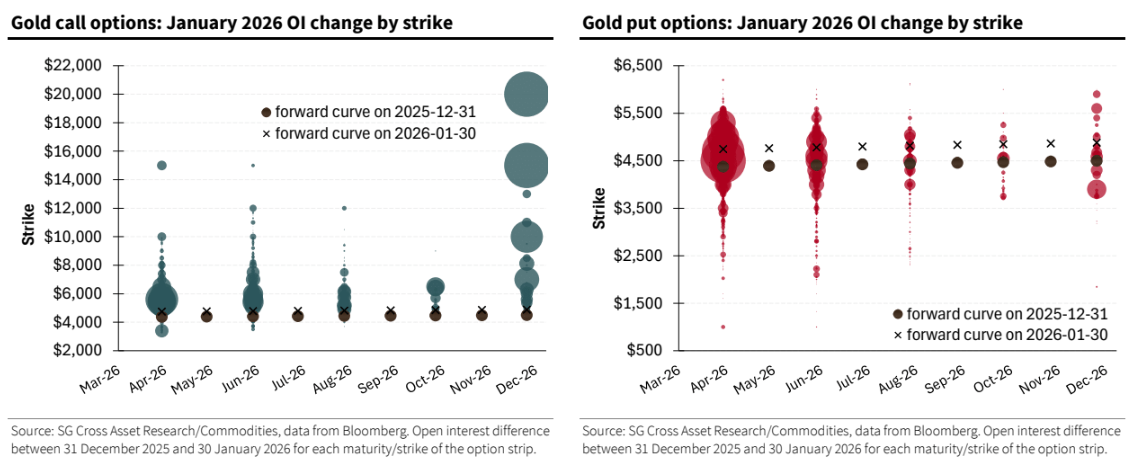 Gold:Fast up, fast down.As we wrote last week, we remain bullish on gold as we believe the fundamental rationale for precious upside remains despite one area of uncertainty being removed–namely lower Fed institutional chaos. We always believe a correction can be very healthy. Nonethless, beyond our own outlook, looking to recent changes in the option landscape helps us gauge sentiment and monitor levels risk that are being managed. We can see that based on the closing Friday data, the most notable build, relative to the forward curve is December 2026 with a large build in the $10,000/oz strike and an even larger one at $15,000/oz and $20,000/oz (see section below on timing of these). Looking to the puts, we see much less extreme bets of notable open interest. In December 2026 we see a build at $4,000/oz. By all accounts the extremes to the upside versus downside are very asymmetrical.