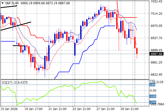 S&P futures are going down fast with the S&P500 four hourly chart showing a drawdown below support at the 6900 point level after a clear stall at the recent highs: