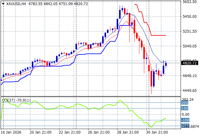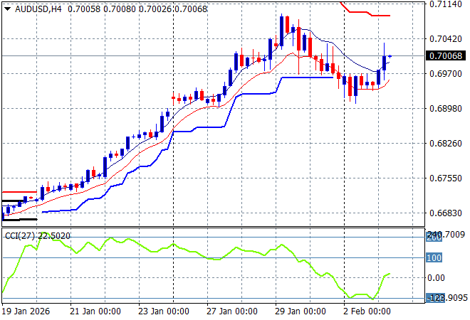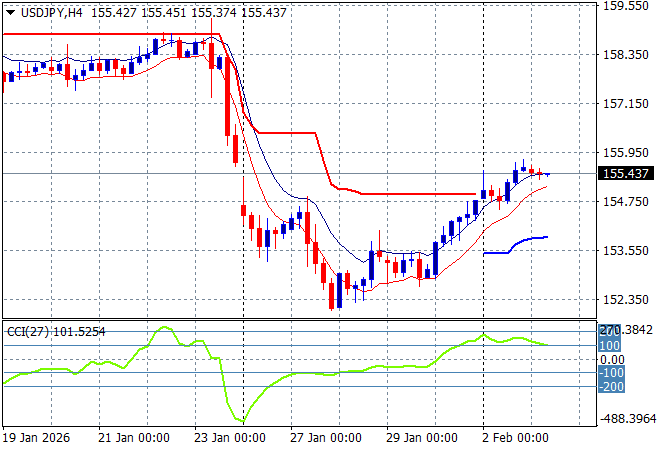 Mainland Chinese share markets are lifting in the afternoon session with the Shanghai Composite up more than 1% to stay above the 4000 point level while the Hang Seng Index is just treading water at the mid 26000 point level. Japanese stock markets are bouncing back the strongest with the Nikkei 225 up more than 3% to zoom through the 54000 point level while Yen is stabilising again as the USDPY pair steadies above the 155 level: