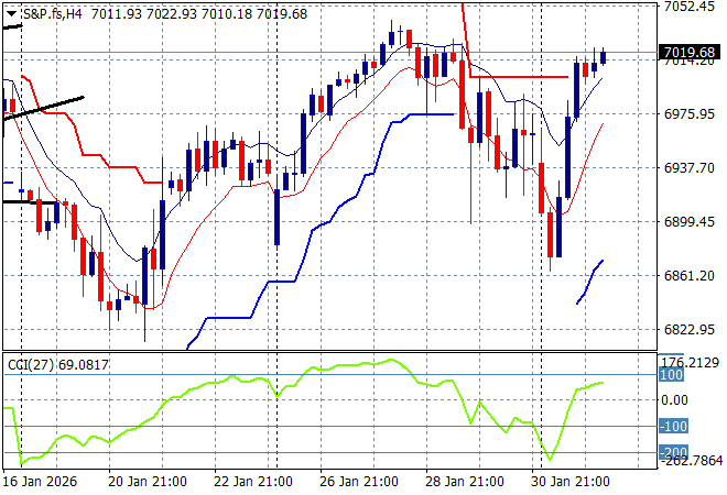 S&P futures are settling in after last night’s rebound with the S&P500 four hourly chart showing a fill after bouncing off support at the 6900 point level to return to the recent highs: